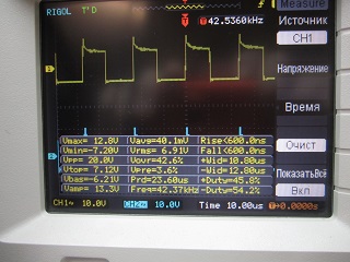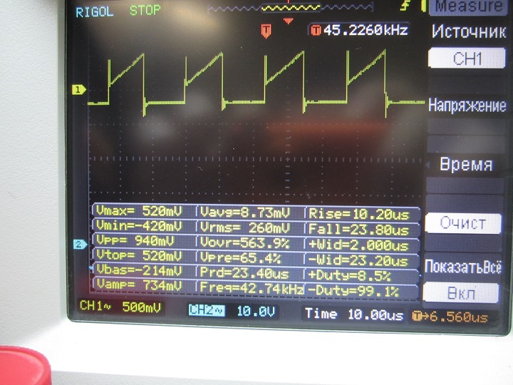 И снова ТИГР. ТГР собрал на RM10 Сначала намотаны первичка и обмотка размагничивания МГТФ по 9 витков ,поверх вторичные обмотки тоже МГТФ по 9 витков. Зазор сделан прокладкой из скотча в один слой( какова его величина должна быть я не нашел ) Вот что на сопротивлении 1ом - 1 канал и на выходе 2-кана...