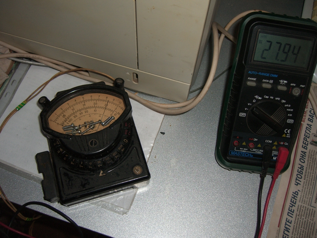 В общем подцепил провода к балласту 25 мм2 и длиной немного более 4-х метров, и измерял напряжение на максимально возможном токе (закон ома в помощь), по приборам балласт составил примерно 0,12 ом, с запасом так сказать, чтоб отсечка по току при 25в не срабатывала. Разницу напряжений на фото видно, однако цифровик немного завышает, примерно на 0,5в по сравнению со стрелочным. Стрелочник подключен на балласт, цифровик на байонеты.