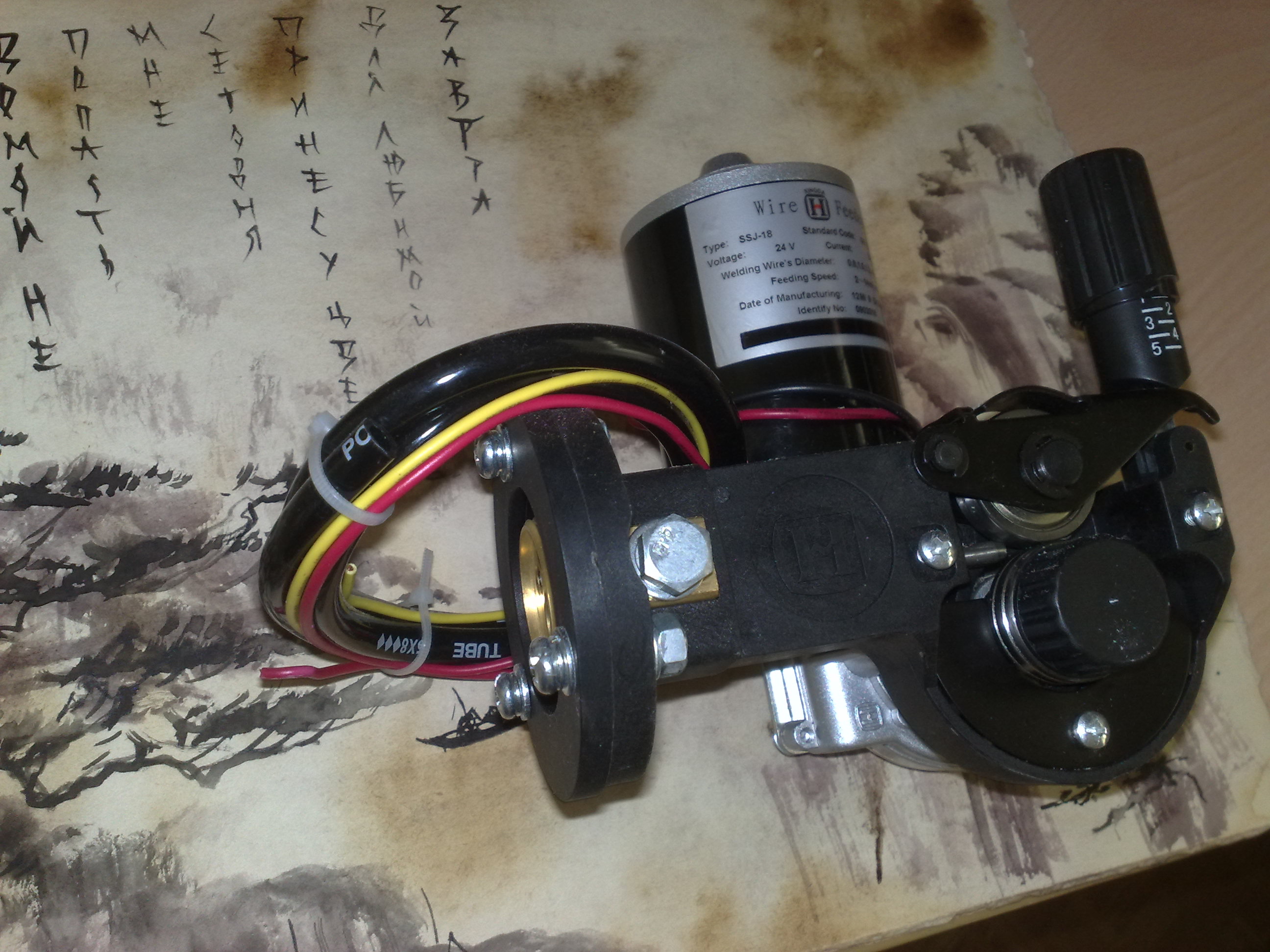 Протяжка как на картинке с первой страницы этой темы. На движке написано тип SSJ-18, напряжение 24В, ток 3А, скорость 2-14 м/мин., диаметр проволоки 0.8, 1.0, 1.2 мм, а вот из сопротивлением обмотки незадача. В разных положениях вала оно меняется от 2,6 Ом до 26 с копейками Ом. Меряю цифровым тестером. Может движок паленый попался. Крутится равномерно, не греется, нагрузку держит. Ток ХХ померяю завтра.