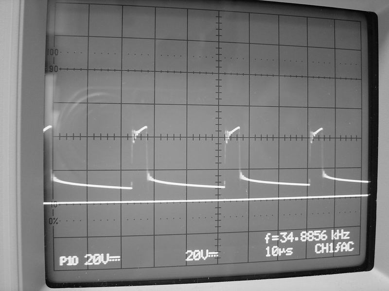 А какая разница, напряжение на балласте полностью повторяет ток в дросселе. Должен быть треугольник, т.е. заряд индуктивности-разряд через нижний диод.Komrad писал(а):...На нижнем фото осцила от автора сварника Супер Джон, она очень похожа(на мой взгляд) на Ваш чертеж, но это напряжение на выходе. Может я и ошибаюсь в толковании не соответствия чертежа Спице - уж не судите строго.