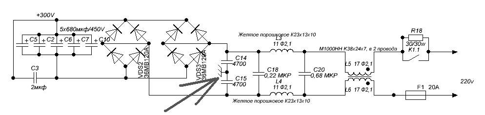 Komrad и hantmaster к вам обеим вопрос. У вас установлены те конденсаторы что стрелкой обозначил на схеме? Имеется ввиду в питателе управы и силовом выпрямителе. Мот они уберут потенциал с корпуса.