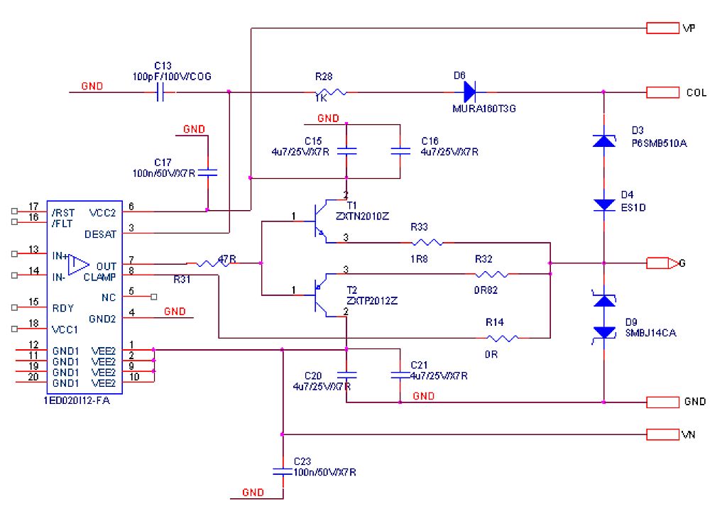 Может и оплошность, Х.З. На странице 16 вверху фото драйверов, кто хочет может сравнить схему драйвера баяна и само железо. ТО что там есть пару "лишних" деталей (на схеме они тоже есть ) легко объяснить - мне было неизвестно будут работать эти драйвера или нет и потому на тех же печатках есть возможность организации отрицательного напряжения на затворы. Как показала практика, без отрицаловки можно обойтись, как и без резисторов в эмитерах. Где-то есть у меня одна статейка по поводу этих резисторов, если найду - выложу.kava писал(а):Скорее оплошность в схеме, иначе что там делать стабилитрону. Наверно предпологалось примерно так, или как у Infineon