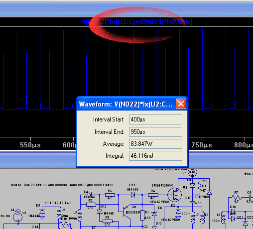 У меня спица 4 той версии что-то не показывает средней мощности - показывает только то, на сколько верх по графику навожу курсор от 0...до 2квт.Затем подводите курсор на надпись на осциллограмме и с нажатым Alt Спица Вам покажет среднюю мощность. У меня в примере, что я Вам дал получилось 63w.