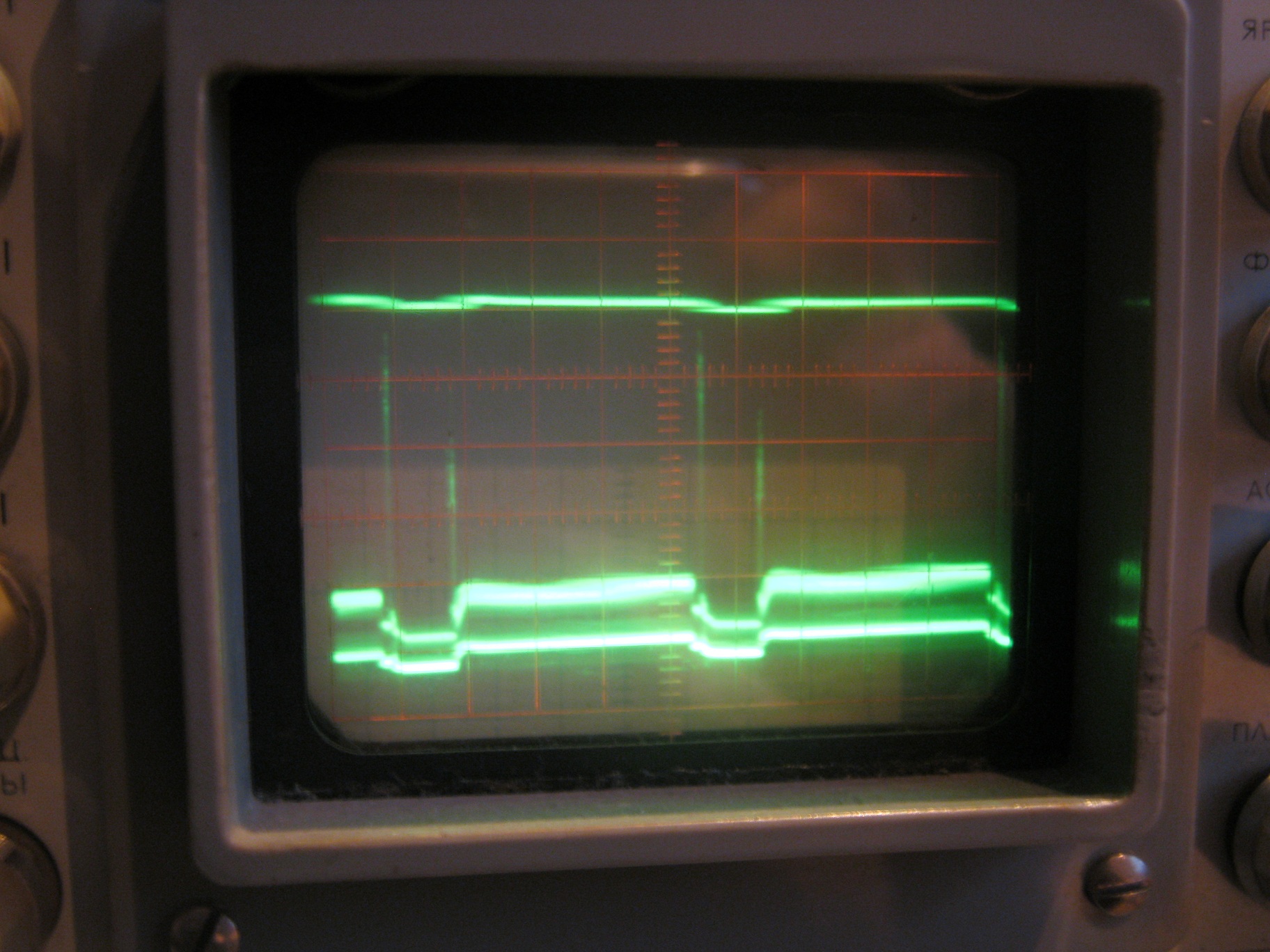 На осцилках 50 Вольт на клетку, вторым лучем подсвечен уровень 250 Вольт.