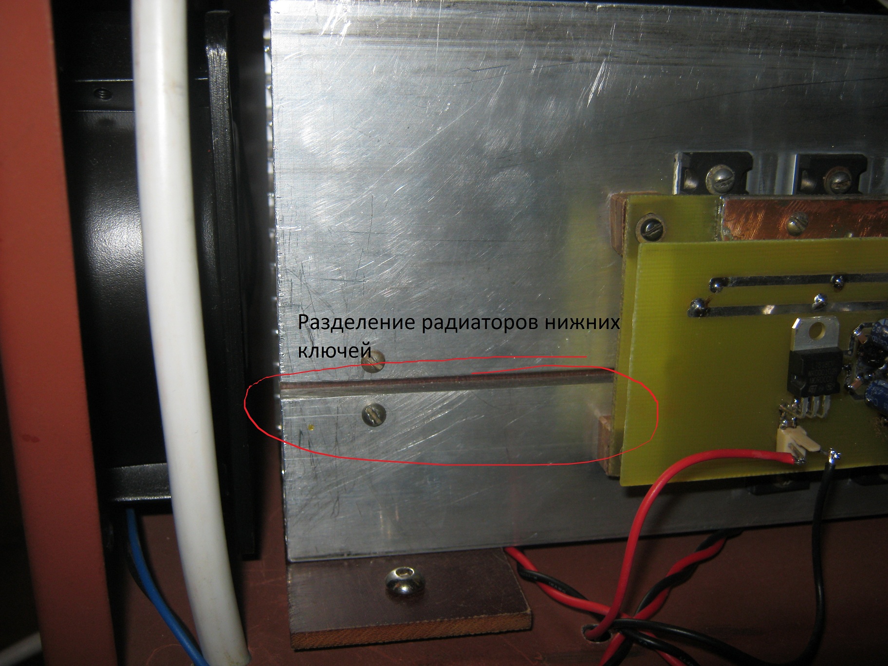 Монтаж элементов на радиаторах соответствует нижней и верней частям схемы, этом слудет учитывать, что фланцы транзисторов и их коллекторы соединены. Следовательно для организации нижней части схемы (дальше «нижние ключи») один радиатор следует распилить с учетом выделяющегося тепла а плечах. Радиатор верхних ключей остается монолитным.
