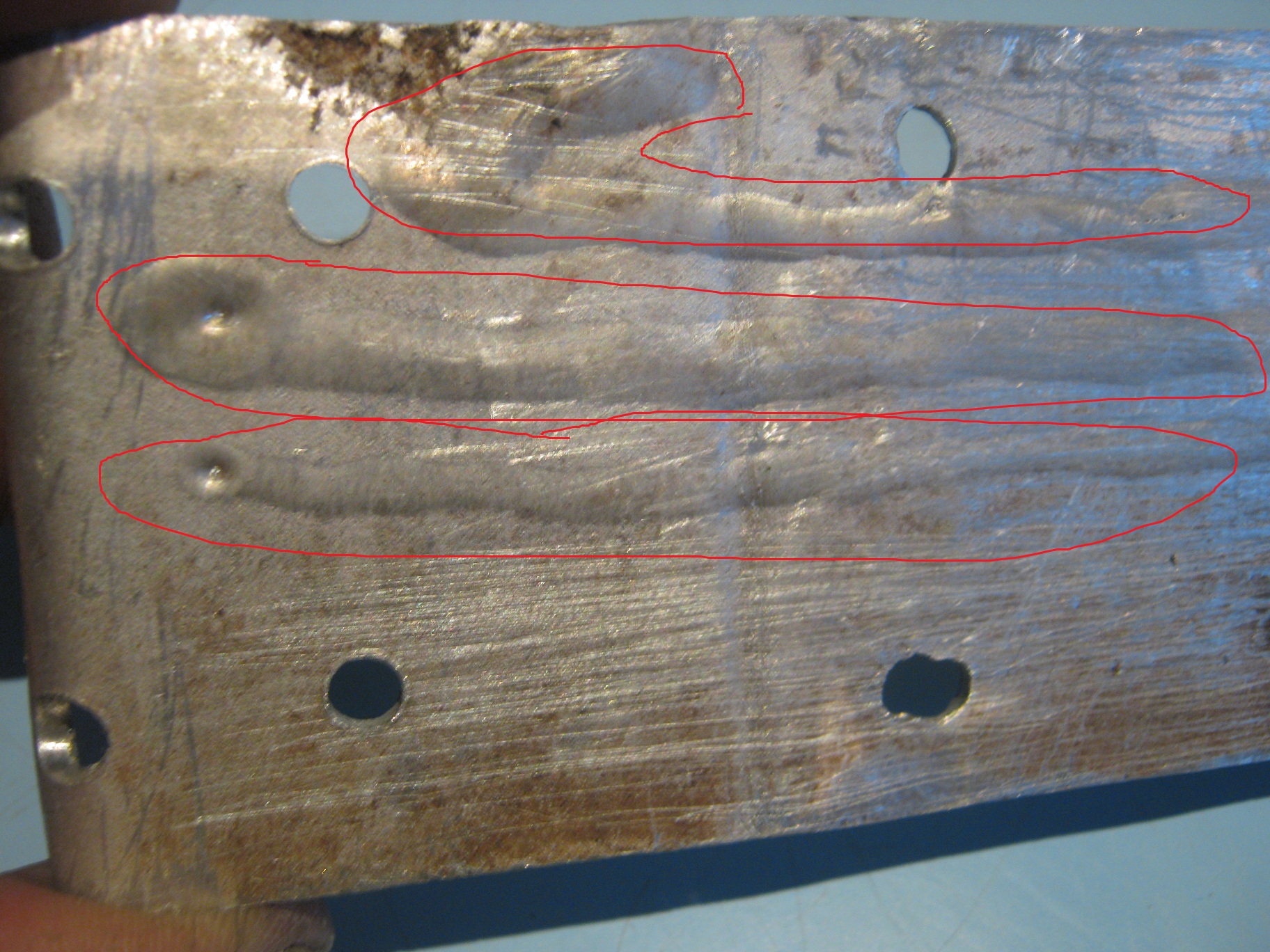 После выставил 100 Ампер, 75 ГЦ, EP 20 и протянул четыре ванны по образцу 2.8 мм. В сумме получилось около полуметра такого "шва". Изначально расчитывал погрузить аппарат подольше, но образец оказался маловатым и разогрелся будь здоров. Второй, третий и четрвертый проходы почти "вываливались", я к такому развитию событий не был готов( в плане не заготовил более весомый кусок алюминия) ну и эксперименты пришлось прекратить. Время действия засечь не догадался. Тестер с термопарой показал изменение температуры монолитного радиатора на +3 градуса. На "палец" все холодное.