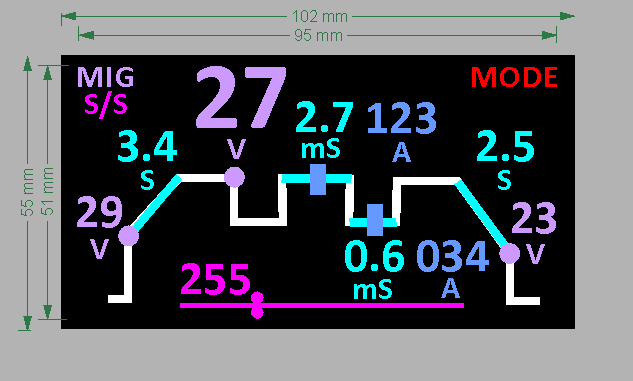 Зона 255 (закорючка с линией символизирует период работы подачи) - зона кнопки Fst - задание скорости подачи проволоки