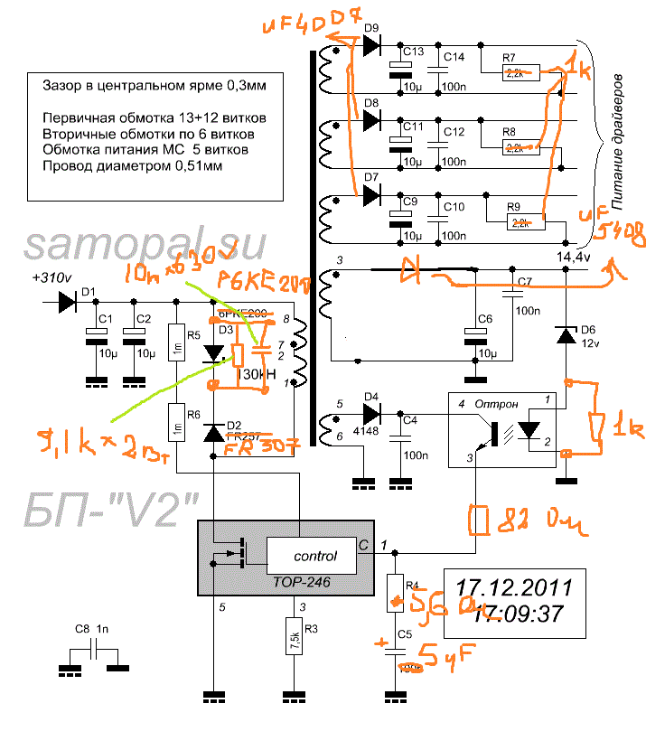 Даташит на ТОП похоже смотреть лень. Емкость С5 должна быть 47 мкФ вместо 5 мкФ, дополнительный резистор тот что 9,1 кОм тоже маленький. Он должен быть хоьябы 33 кОм (повидимому остался жив по причине того что блок не стартонул), конденсатор тот, что паралельно этому резистору как по мне так великоват. Это то что сразу бросилось в глаза.hantmaster писал(а):да схемка почти та шо на сайте тут