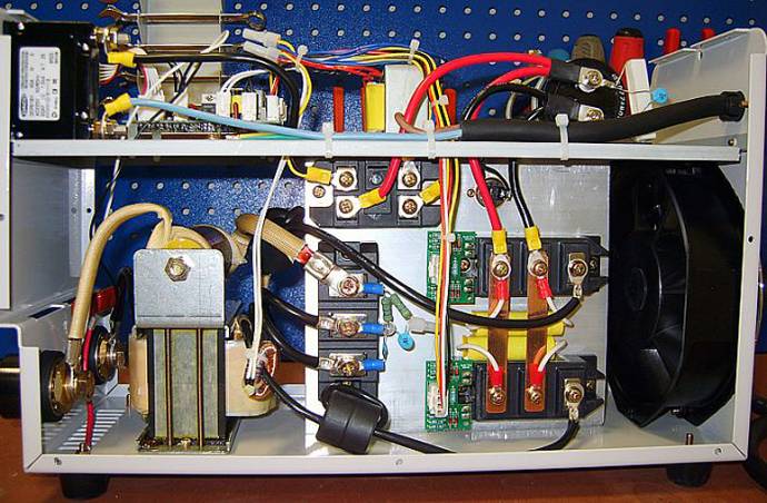Что касается видео. ИМХО.Мощи хватает и аппарат похоже не хилый, но с заявленным током они погорячились. 225 Ампер для электрода 5-ки по таблице, а там 4-ой валят, это ближе к резке должно быть. Плюс к тому шов делает широкий,да и время на сгорание электрода...А габариты и вес дело такое. Была где-то фотка импортного ММАшника, один электролит на входе, ключи - модуль. В том корпусе места свободного для двух сварочников. Если найду-выложу.