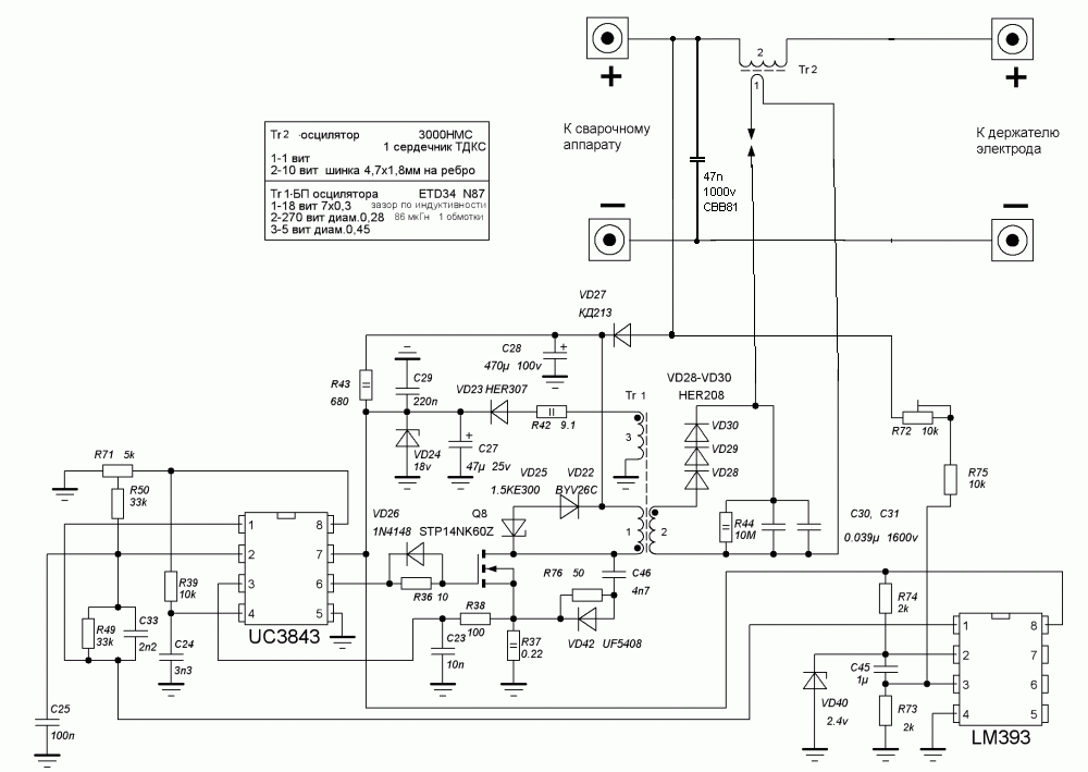 обратноход, питающийся от ТИГаmehanik писал(а):Если схема, в принципе, отработана, то к нашему сварочнику пойдет без проблем. Замыкающая емкость есть С22. Схема выходного каскада идентична, количество витков транса совпадает, только вторичную обмотку транса осцилятора подключить в разрыв плюса - как у нас и все. Дроссель и замыкающую емкость устанавливать по схеме СЭМА.