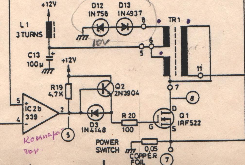 Ограничивает на уровне 12+ Uпитания.PAVEL писал(а):...Стабилитрон и диод на обмотке 1б ограничивают напругу обратного хода на уровне 12в,....