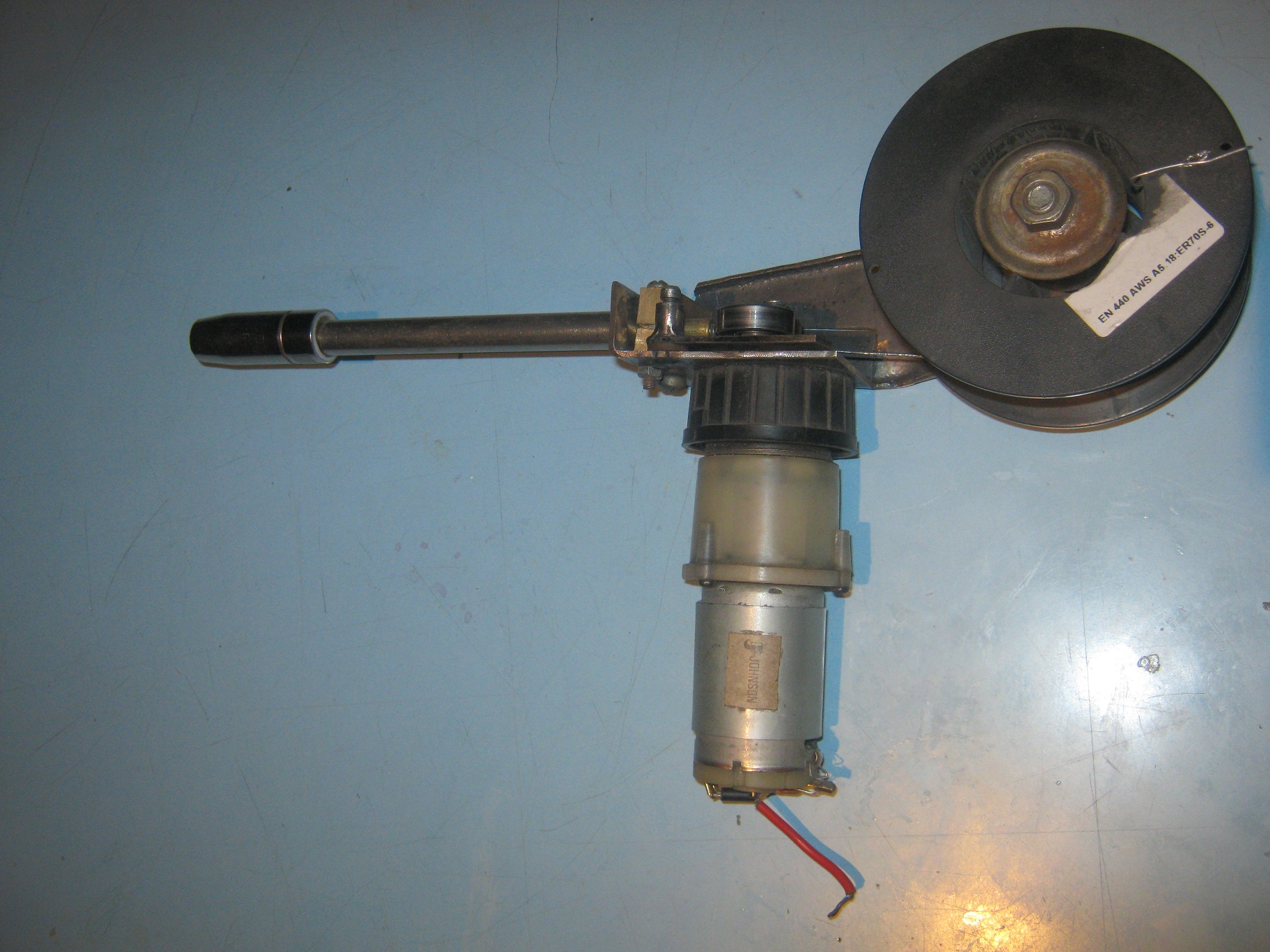 Сперва о креплении ролика. На фотке ниже показан вал шестерни редуктора, такой-же в моей подаче. Ролик по центру имеет углубление диаметром больше зажимающей гайки. Гайка высокая, примерно 12 мм. В ролике по центру было рассверлено отверстие, а потом надфилями доработано согласно валу.