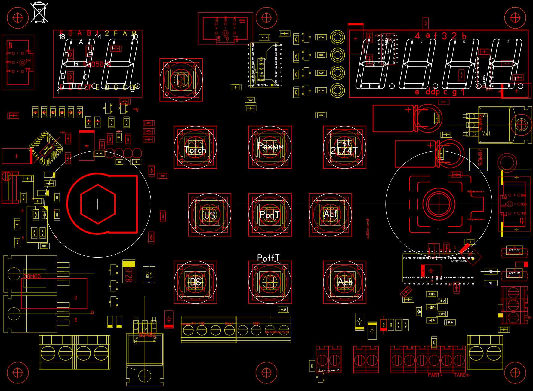 Как ты быстро панельки рисуешь,для наглядности конечно надо. Что за кнопочки по сторонам,или крутилка для подачи,растояние до кнопок будет мало, немного по более будет лучше.Там еще есть кнопка по переключению малого сегментника,это для ручного режима,отображает температуру или метры/мин.Не по ленись почитай еще раз как все работает.И надо уже печатку разводить.