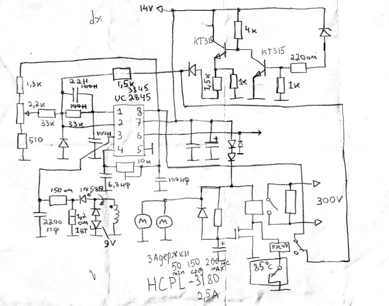 Еще одна может быть не предвиденная проблемка микросхема UC2845 выключает свою работу при напряжении что то 7,5 вольта, а так как этим напряжением запитываются драйвера IGBT то это может быть моловато для затворов.