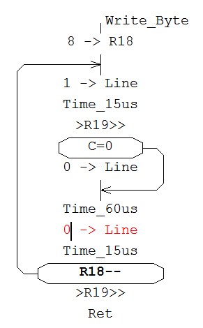 Вот, из п-пр 1wire, после сдвига правый бит попадает в С-разряд, и сразу анализируем, С равно единице или нулю. Если единице, то отправляем в линию ноль, а если нулю, то перепрыгиваем через строчку.
