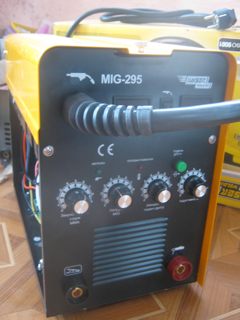 Принесли из магазина вот такой Кайзер, они торгуют подобной техникой. Говорят не варит нормально. Подключил, зарядил проволоку, углекислоту, а потом и ММА опробовал. В общем покрутил круциками туда-сюда и варит он будь здоров. Правда показометры напруги и тока вообще сами по себе, но это не столь важно. Оказалось, что газ идет постоянно, даже если аппарат выключить. Вскрытие показало ОТСУТСТВИЕ газового клапана