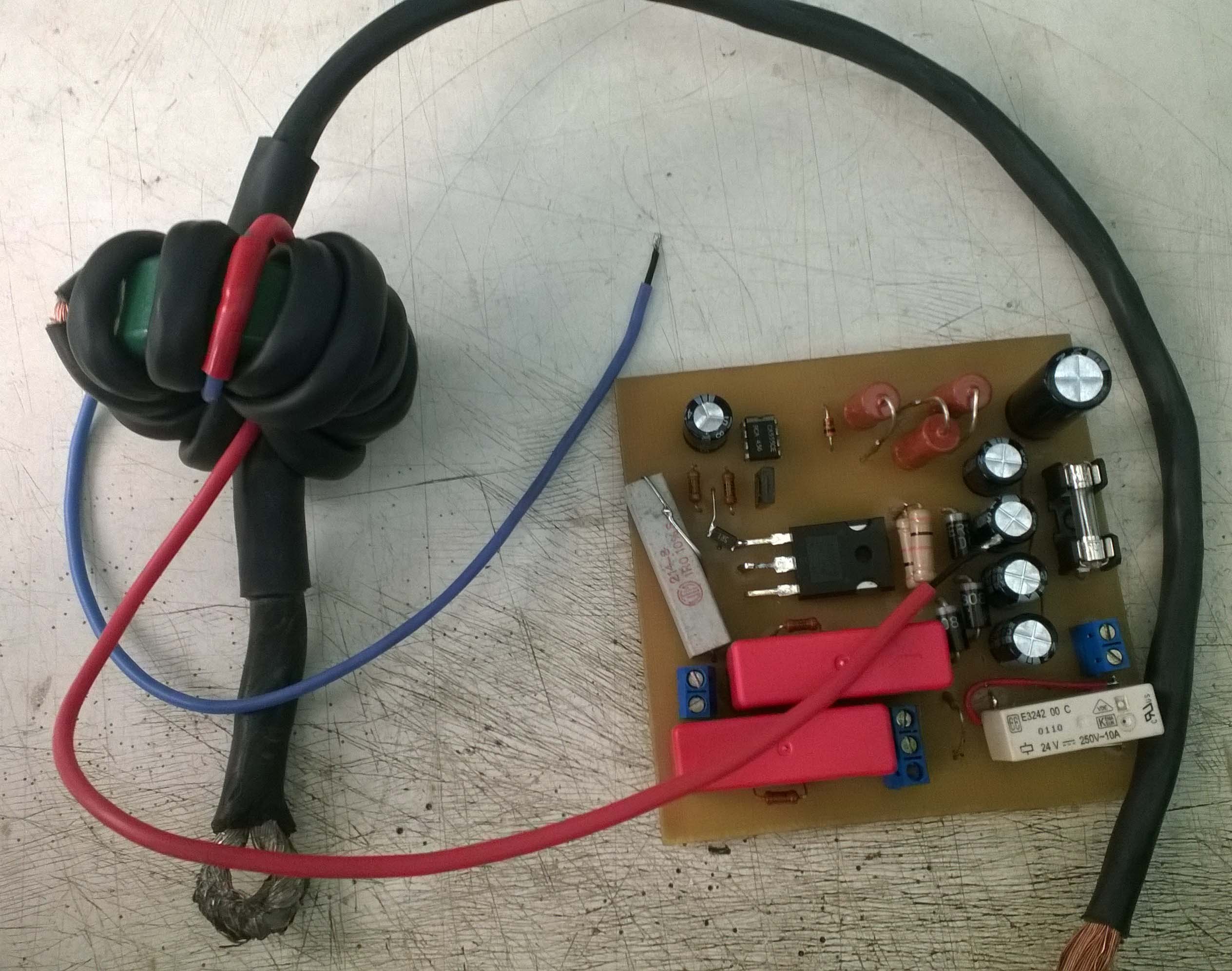 мотал на кольце К50. 11 витков вторичка проводом 16 квадрат, со снятой оплеткой и замест нее надета термотрубка с клеевым слоем диаметром 9мм и обдута. Вторичка 2 витка проводом от ксеноновой лампы с резиновой изоляцией.