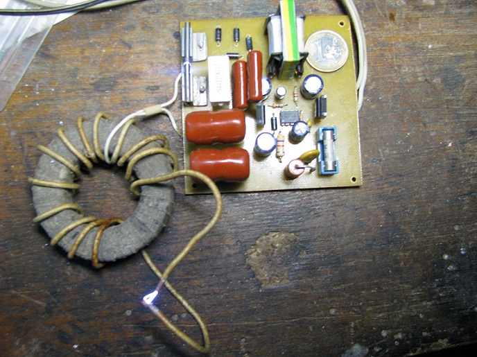 Странно, феррит гавно и витков не много, но ничо не рвануло. Раз двадцать пробовал запускать. Видать таки ИР стартует плавно. Трохе великоват по габаритам, монетка в один евро рядом для сравненияю. Но фиг с ним с габаритом.