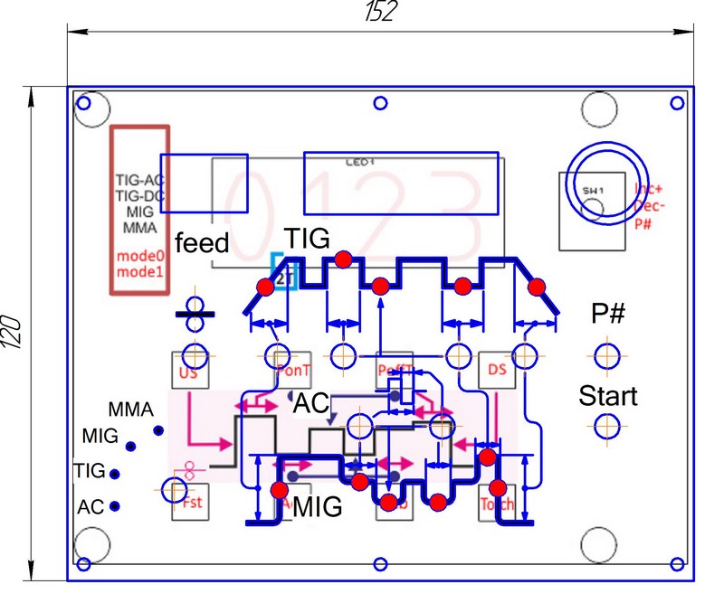 Чё-та я не очень понял. Можно чуть больше букв?PAVEL писал(а):Программы отображаются на основном индикаторе например Р-5,Р-2и т.д для этого нажимам кнопку Р# .Это получается что на каждуй режим сварки нужно свою позицию галетника чтобы подсвечивался свой участок диагроммы потому как на каждом режиме работают сдвоенные кнопки ,и на разные режимы.Много получается позиций 4 штуки.Ну и замутили мы кашу а хотели тока плату порисовать