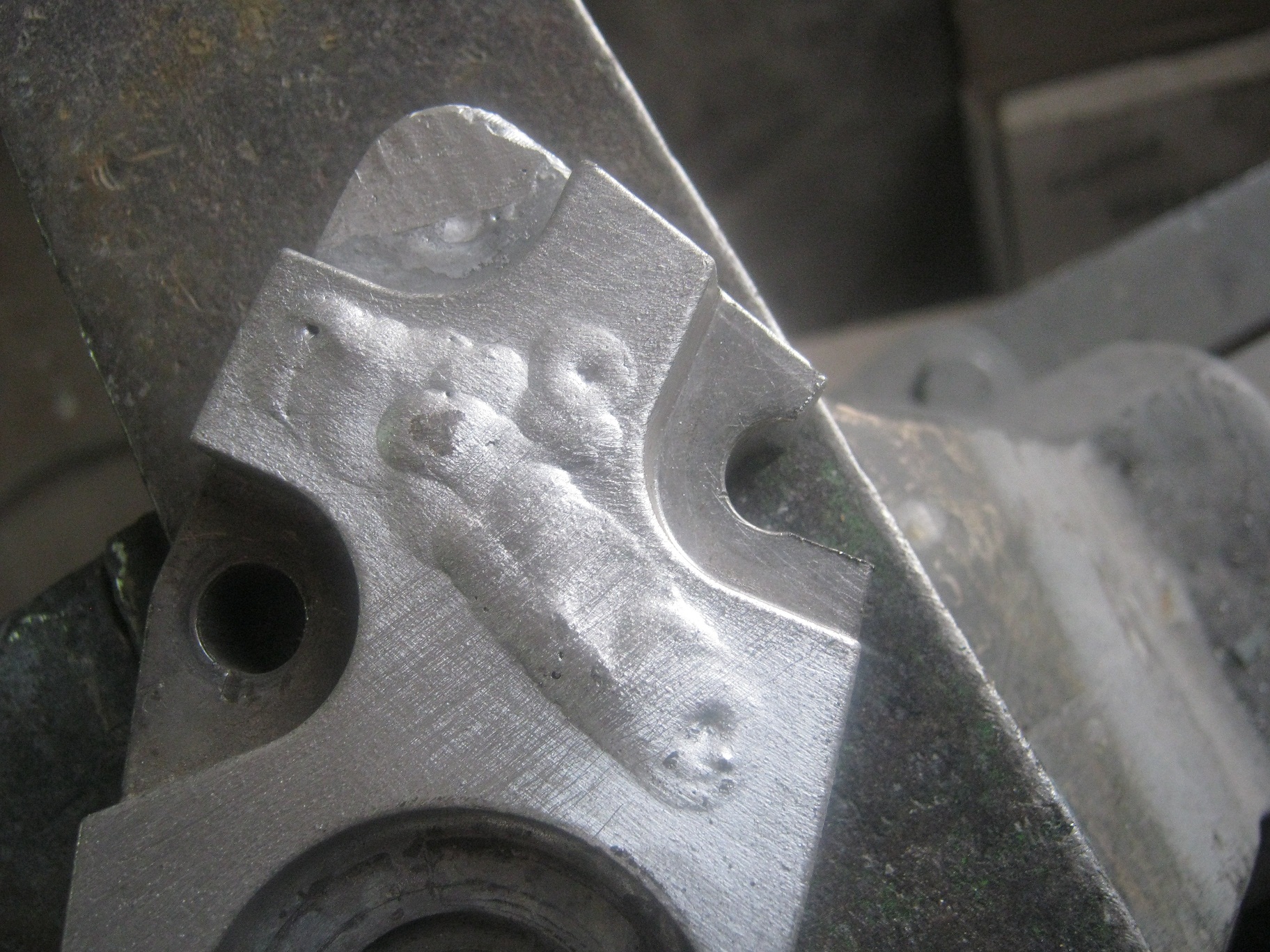 Устроил небольшой треннинг на подопытном кронштейне натяжного ролика ремня ГРМ. Вырезал пару кусочков детали и наплавил на их место 4043.