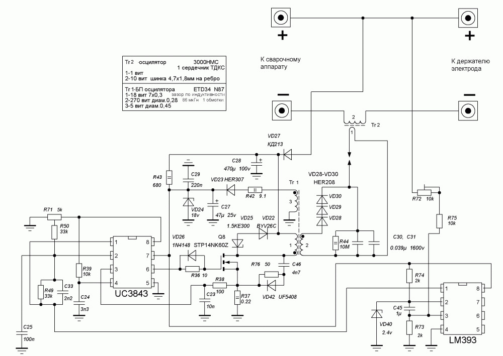 mehanik писал(а):Если схема, в принципе, отработана, то к нашему сварочнику пойдет без проблем. Замыкающая емкость есть С22. Схема выходного каскада идентична, количество витков транса совпадает, только вторичную обмотку транса осцилятора подключить в разрыв плюса - как у нас и все. Дроссель и замыкающую емкость устанавливать по схеме СЭМА.
