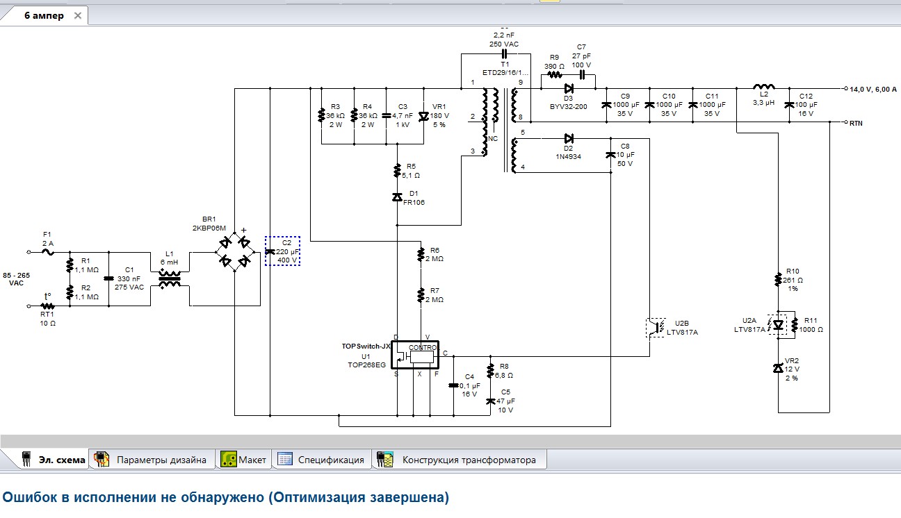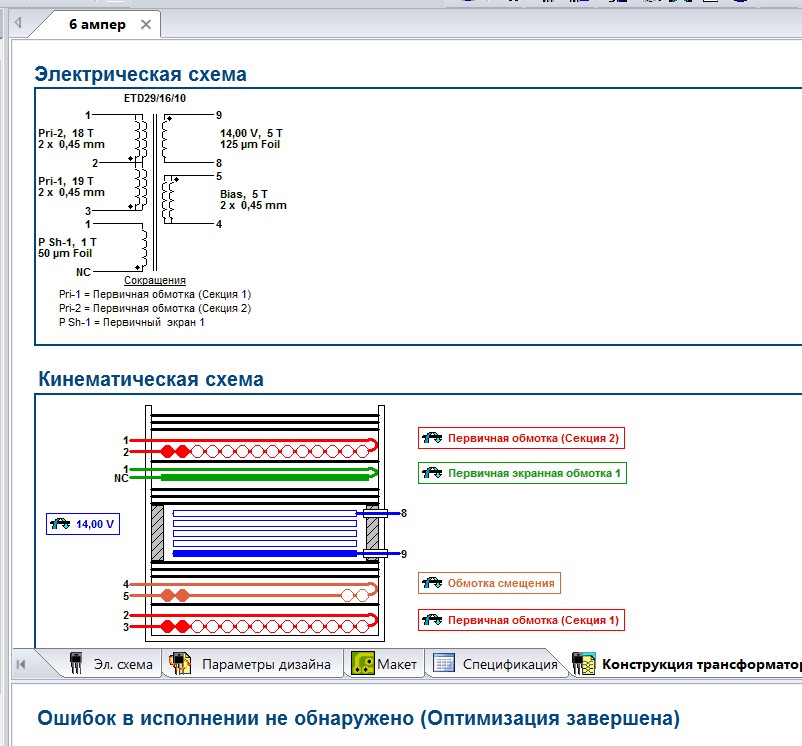 Нет, не правильно. Я зарапортовался. Я всё делал по PiExpert. Чё я там делал, ужо не очень помню, но вроде так, как на моей схеме. Вот, переустановил Винду. Поставил опять Эксперта, посчитал. Получилось кое-что другое. Есть маленькие отличия. Вот как у Эксперта и делайте. Я даже вспомнил, что первичку мотал в 2 провода. А фольга, как видно 0,125х14 мм.